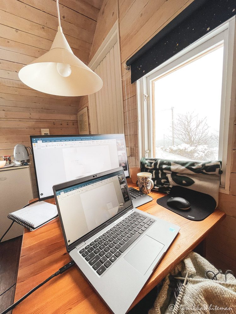 Otin läppärin lisäksi mukaan erillisen näytön, ja mökin pieni pöytä riitti mainiosti työpisteen pystyttämiseen. Aina huono puoli oli, että ikkunasta veti, mutta ratkaisin asian laittamalla viltin ikkunan eteen. Kuvassa ratkaisuni näkyy. Pieneen mökkiin sai siis yllättävän hyvän työtilan.