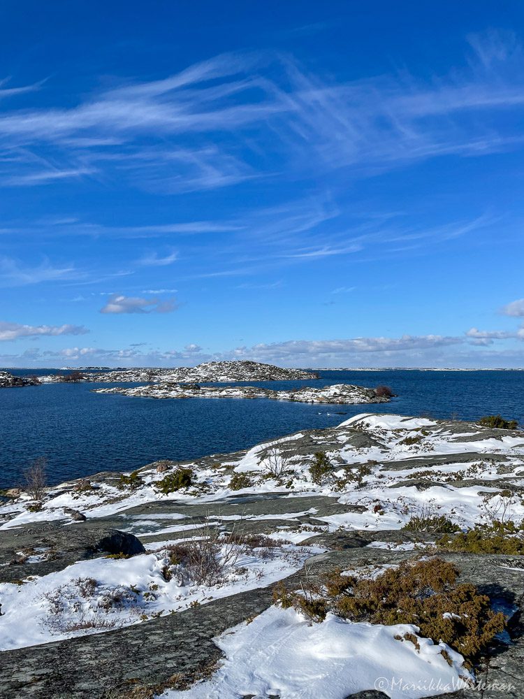 Työpäivien päätteeksi lähdin Hamnön luontopoluille tai mihin milloinkin. Muutamassa minuutissa olin keskellä kaunista luontoa, kallioita ja tuulen tuiverrusta. Peipot ja kottaraiset olivat viikolla vakiokavereitani, ne taisivat ihmetellä lunta yhtä paljon kuin minä.