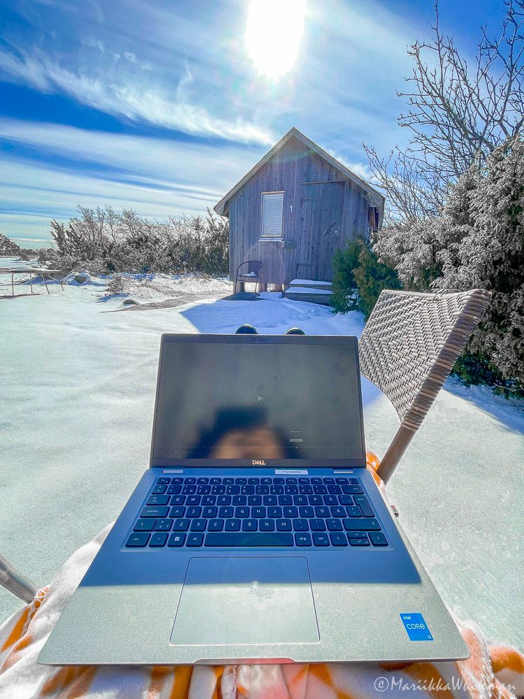 Käytin nettiä puhelimeni kautta ja se toimi yllättävän hyvin – yhteys katkesi muutaman kerran ja silloinkin se tarjosi hyvän syyn nostaa katse ruudusta ja lähteä hetkeksi ulos. Teams-kokouksetkin sujuivat kännykän nettiyhteydellä hyvin.