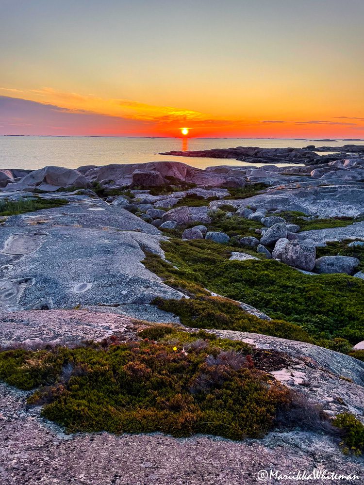 Ilta oli rauhallinen ja kiipesin teltaltani saaren toiselle puolelle ihailemaan auringonlaskua. Suomessa kesäyöt eivät ole koskaan pimeitä, joten valoa on runsaasti auringonlaskun jälkeenkin.