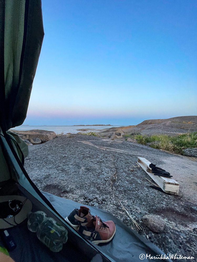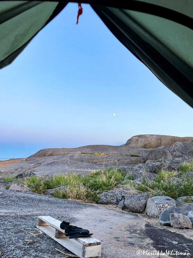 Rakastan kesäyön valoa saaristossa, pastellivärien valikoima on todella laaja. Pystyin istumaan teltassa ovet auki, sillä ei ollut yhtään hyttysiä. Ovensuusta näin kuun mollottavan taivalla.